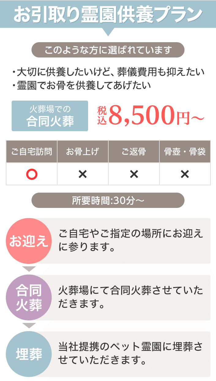 - ご予算を抑えたいという方には「お引き取り霊園供養プラン」をお勧めしております。お引き取り霊園供養プランとは、他のペットちゃんと一緒に火葬を行い、お骨もまとめて骨壷に納め、慰霊塔などに納めて供養を行う葬儀です。「個別火葬一任プラン」や「個別火葬家族立会プラン」と比べると大幅に費用を抑えることが出来るので、「お金は掛けられないけれど供養をしてあげたい」という方にお勧めのプランです。
