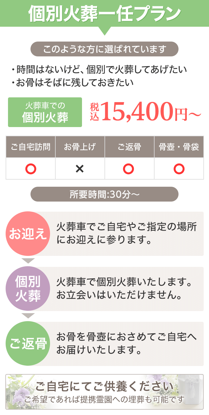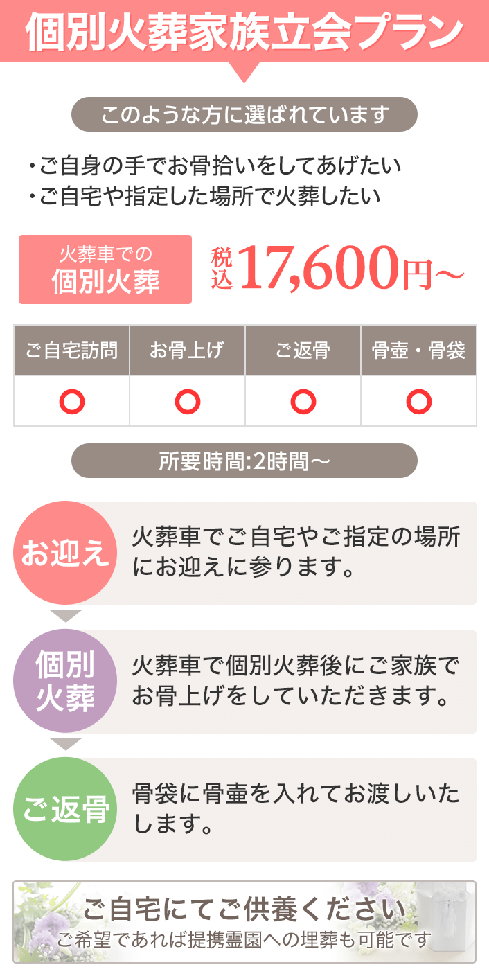 お骨拾いを行っていただけるプランをご用意しております。その他にも様々なプランがございますので、まずはお電話ください。弊社加盟店が無料でお見積りさせていただきます。